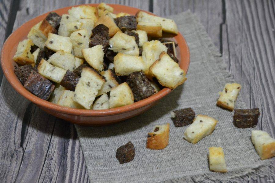 Выложите сухарики на лист для выпечки и запекайте еще 15-20 минут при температуре 150 градусов, следите за готовностью.