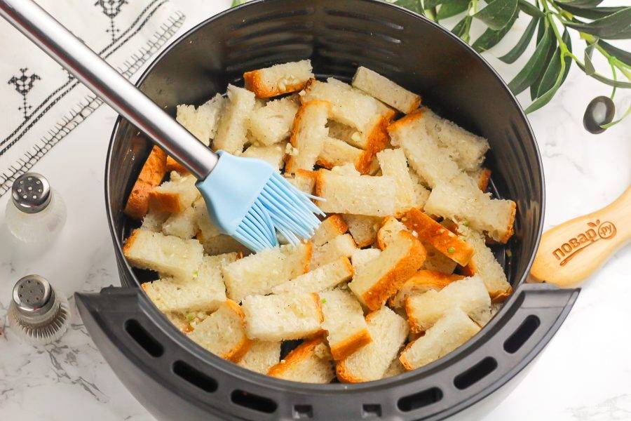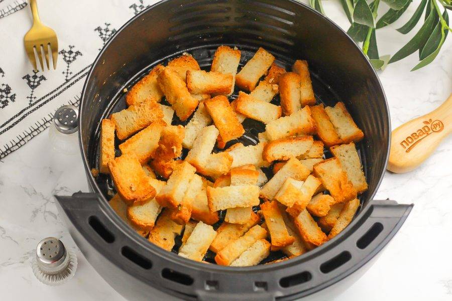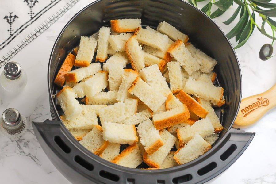 Запеките их в аэрогриле 4-5 минут при 180 градусах. В середине запекания обязательно аккуратно перемешайте их для равномерной обжарки. Мощность техники бывает разной, поэтому ориентируйтесь по цвету сухариков.