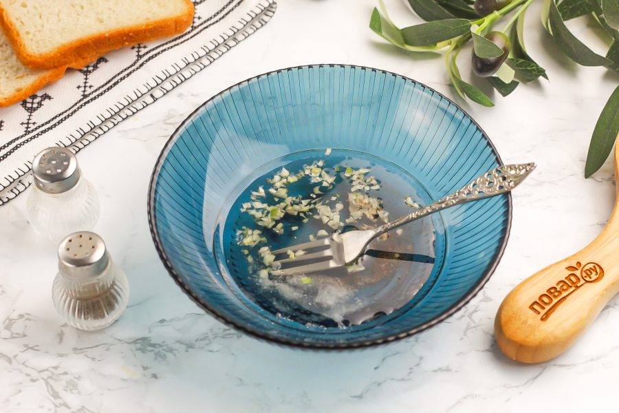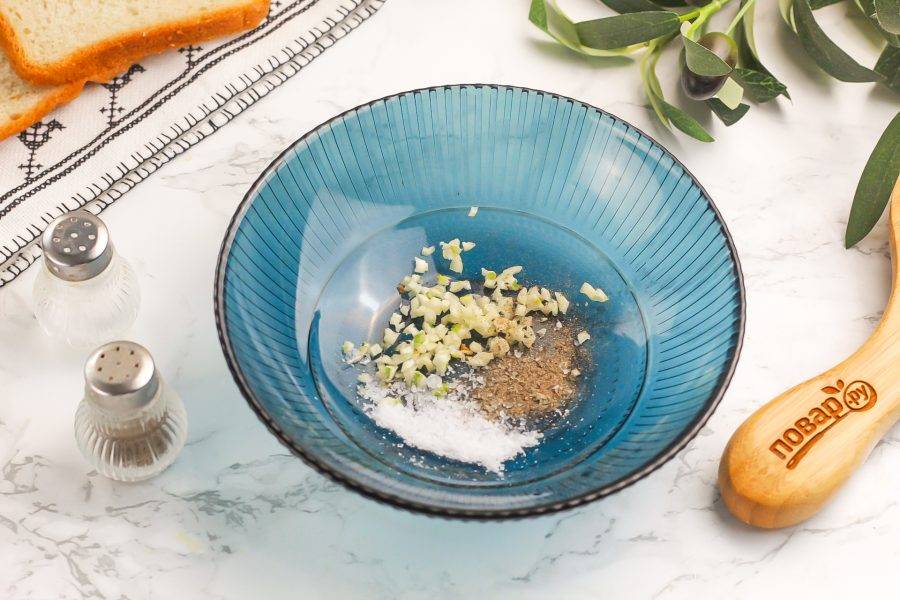 Очистите зубчики чеснока от шелухи, промойте и спрессуйте в пиалу или мелко-мелко нарежьте. Туда же добавьте соль и молотый черный перец. По желанию соль можно заменить любой универсальной приправой.