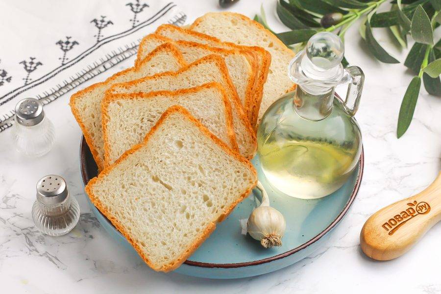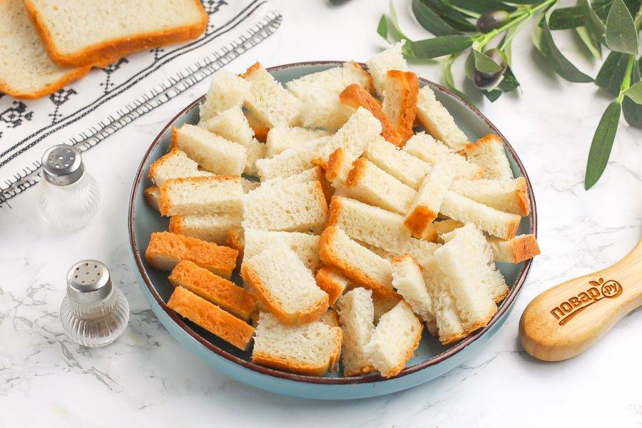 Хлебные ломтики нарежьте брусочками или любым другим образом. Чтобы нарезать их аккуратно, выбирайте кирпичик или батон.