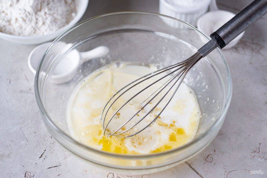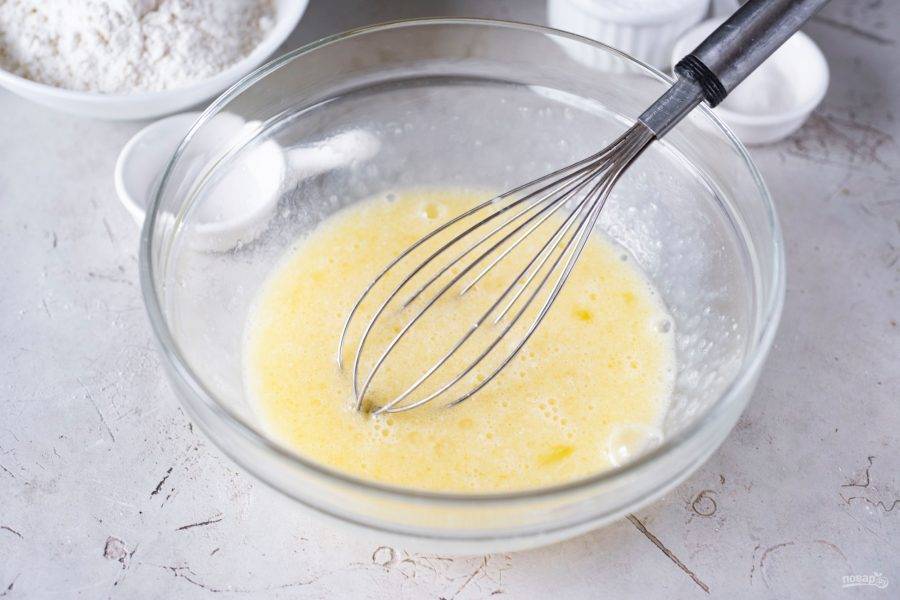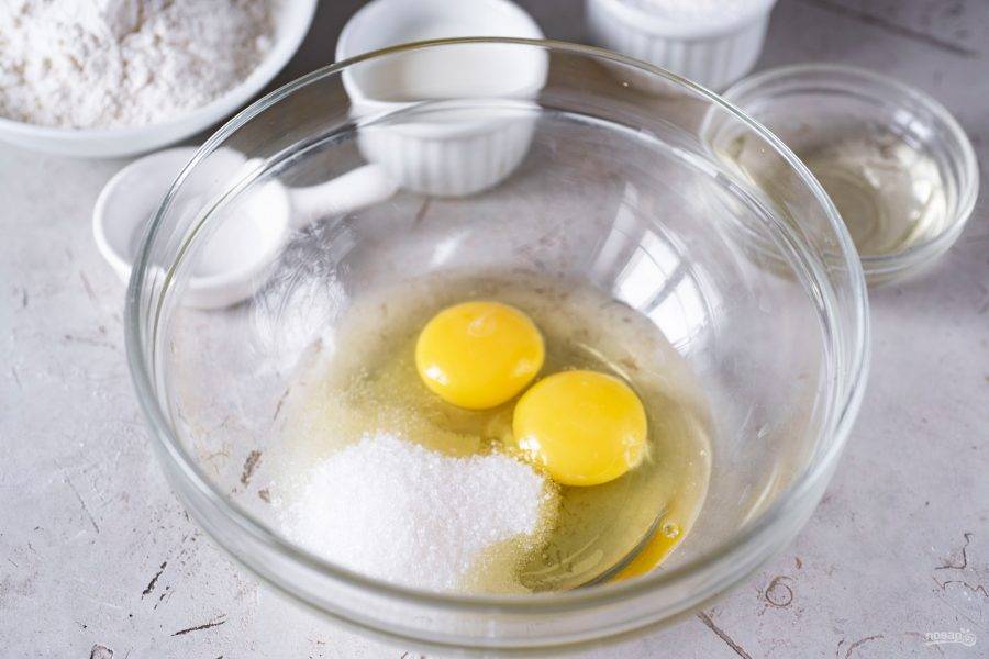 В просторную миску вбейте яйца и добавьте сахар. Взбейте венчиком все до получения однородной смеси.