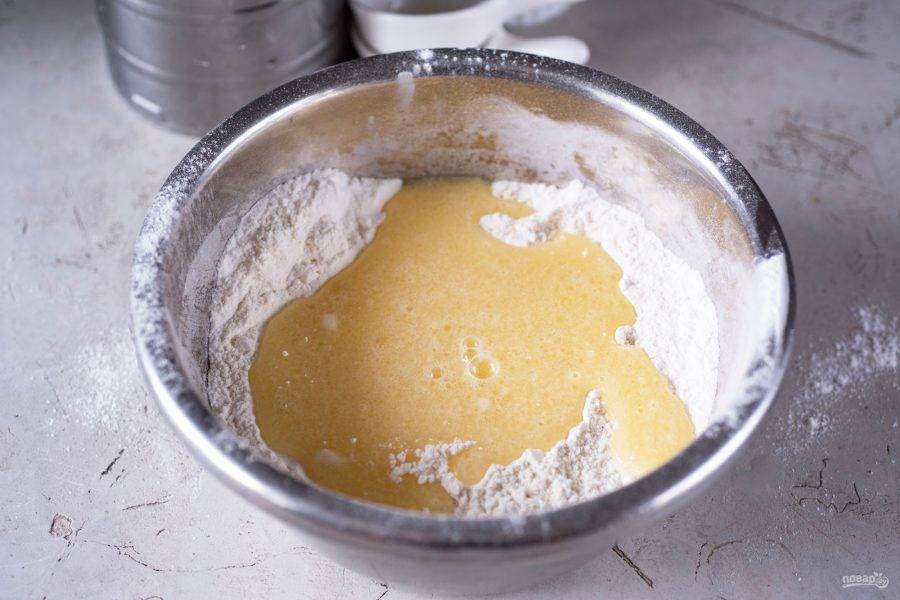 В сухую смесь залейте жидкую смесь, перемешайте.