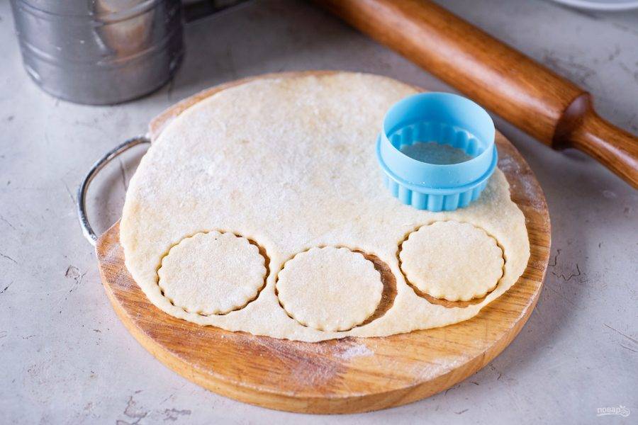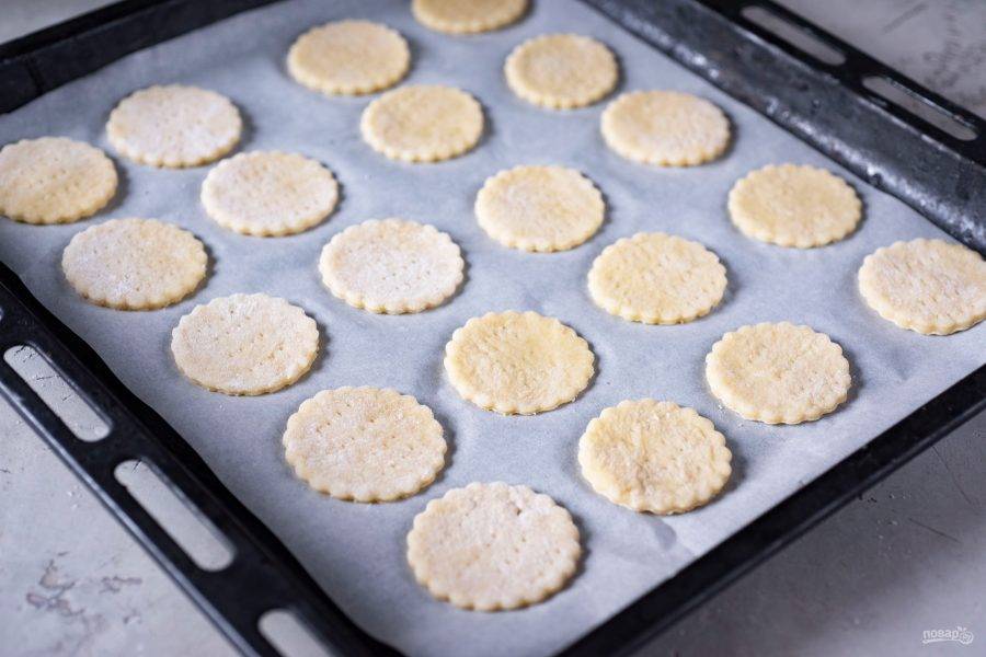Рабочую поверхность чуть припылите мукой и раскатайте тесто в тонкий пласт. Выдавите кондитерской вырубкой заготовки будущего печенья.