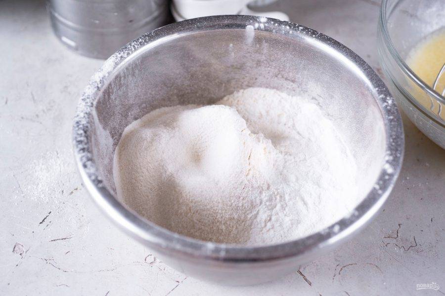 В отдельную миску просейте муку, добавьте разрыхлитель, крахмал и соль. Перемешайте все до получения однородной смеси.