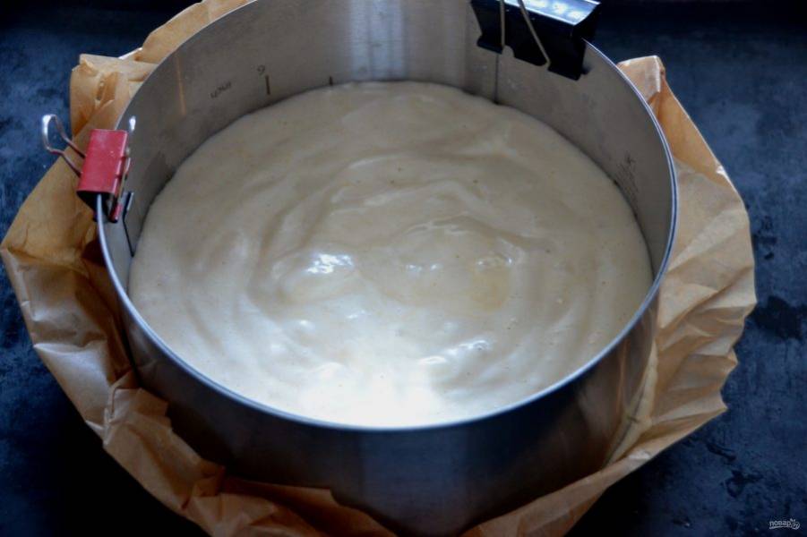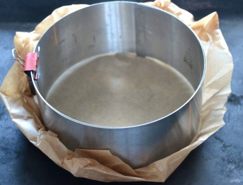 Подготовьте форму для выпекания диаметром 18 см. Установите разъёмное кольцо с бумагой для выпечки сразу на противень.