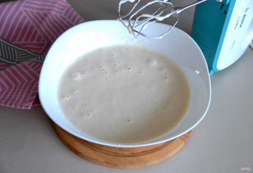 В миску для смешивания вбейте яйца, добавьте щепотку соли, всыпьте сахар.