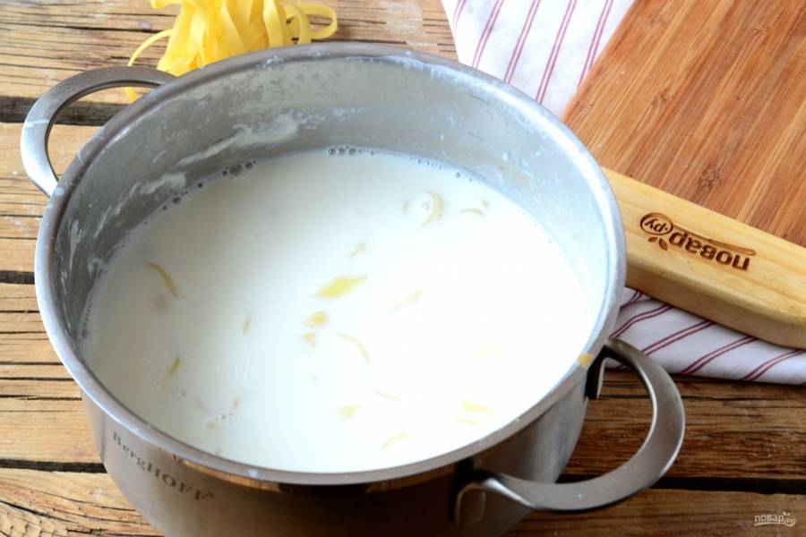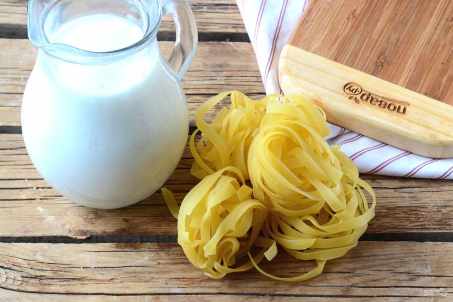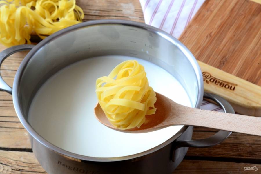 Молоко доведите до кипения, добавьте сахар. В кипящее молоко положите лапшу и поставьте на огонь. Варите на медленном огне до готовности лапши.