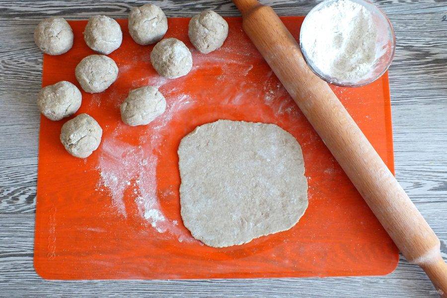 Каждую часть раскатайте в тонкий сочень. Чем тоньше будет заготовка, тем проще будет завернуть в нее начинку.