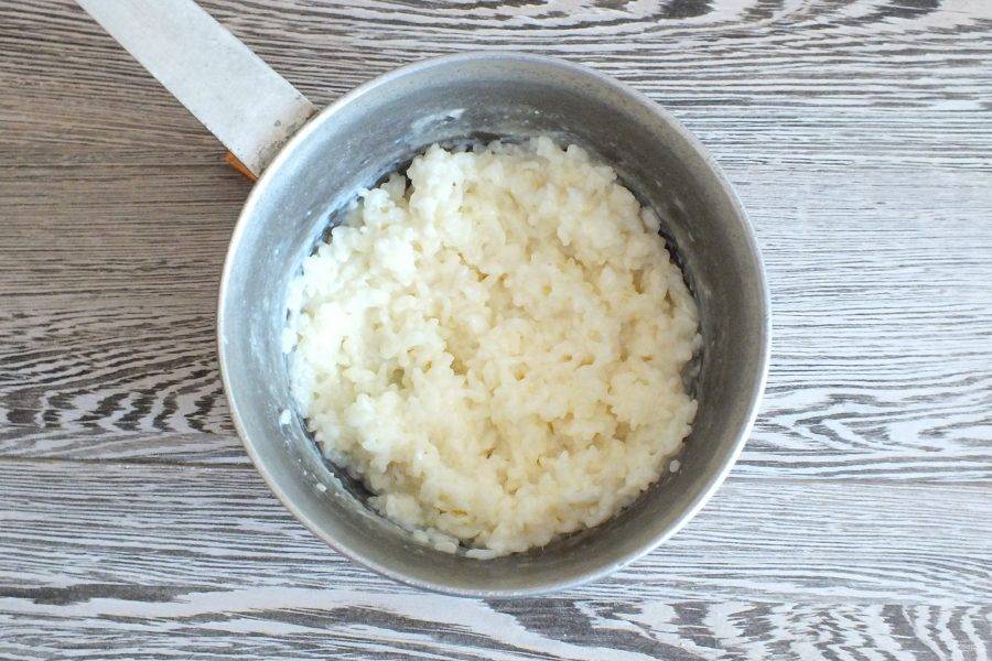 В готовый рис добавьте сахар, перемешайте, прикройте крышкой и оставьте на время приготовления блинов.