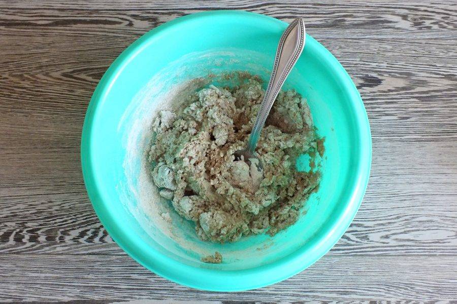 Во время замеса, тесто будет липнуть к рукам. Добавляйте муку до тех пор, пока оно не скатается в комок. Присыпьте готовое тесто обильно мукой.