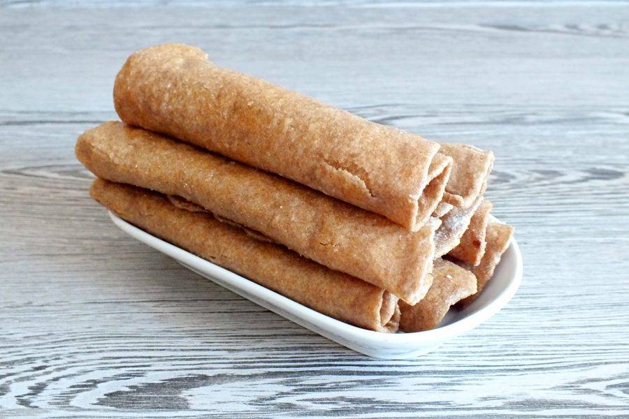 Когда все блины будут готовы, нафаршируйте их рисовой начинкой. Скрутите трубочкой и выложите на тарелку.