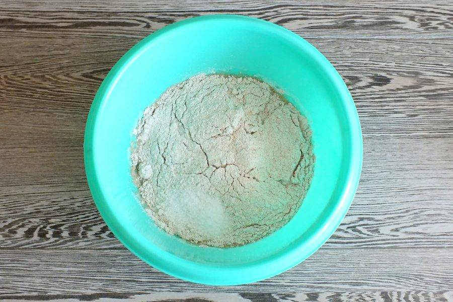 Приготовьте тесто для блинов. В чаше соедините воду, соль и ржаную муку (200 грамм).