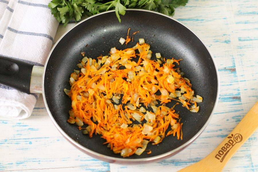 Очистите от кожуры лук и морковь, натрите морковь на терке, а лук нарежьте мелкими кубиками. Отпассеруйте обе нарезки на сковороде в прогретом растительном масле до румяности.