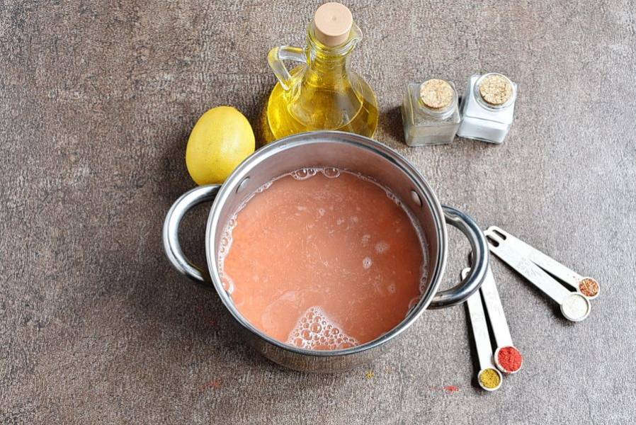 Чечевицу залейте водой в просторной кастрюле. На сильном огне быстро доведите до кипения, затем уменьшите огонь до средне-слабого и снимите пену.