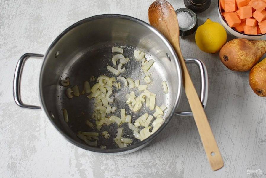 В кастрюле с толстым дном растопите половину столовой ложки сливочного масла. Добавьте мелконарезанный лук и прогрейте при помешивании до мягкости и появления вкусного аромата. Не давайте луку румяниться.