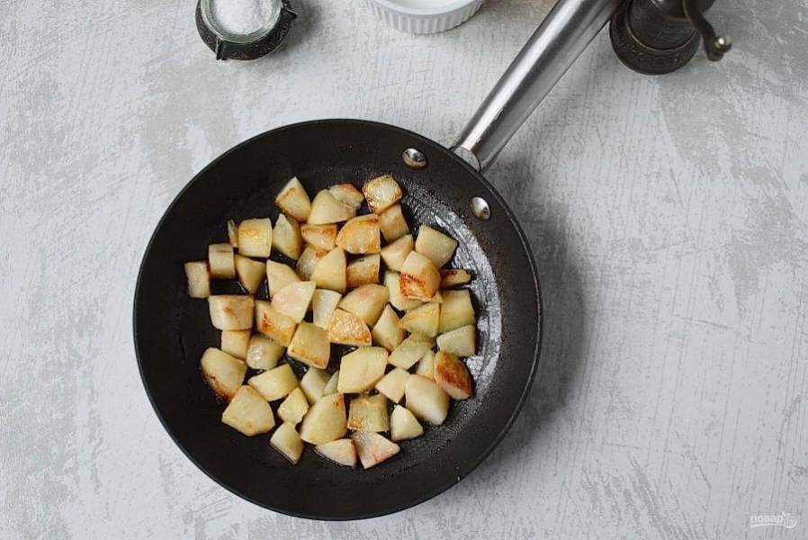 В сковороде разогрейте оставшееся сливочное масло и выложите грушу в один слой. Дайте слегка подрумяниться и карамелизоваться. Аккуратно переверните кубики и слегка обжарьте вторую сторону. Снимите сковороду с огня и оставьте в сторону.