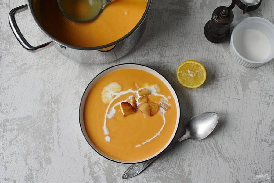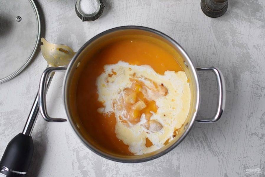 Отложите пару ложек карамелизированной груши для гарнира и добавьте остаток в кастрюлю с супом. Влейте сливки. Снова пюрируйте суп до гладкости.