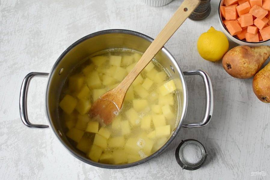 Добавьте нарезанный батат, слегка посолите и варите до мягкости овощей.