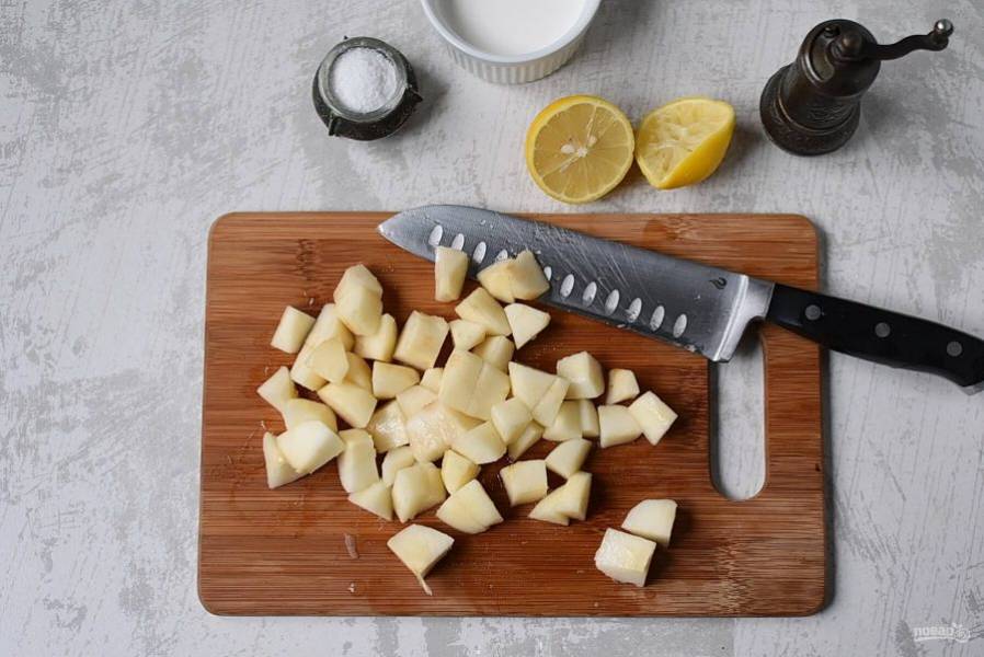Груши очистите от кожуры, нарежьте кубиками и сбрызните чайной ложкой лимонного сока.