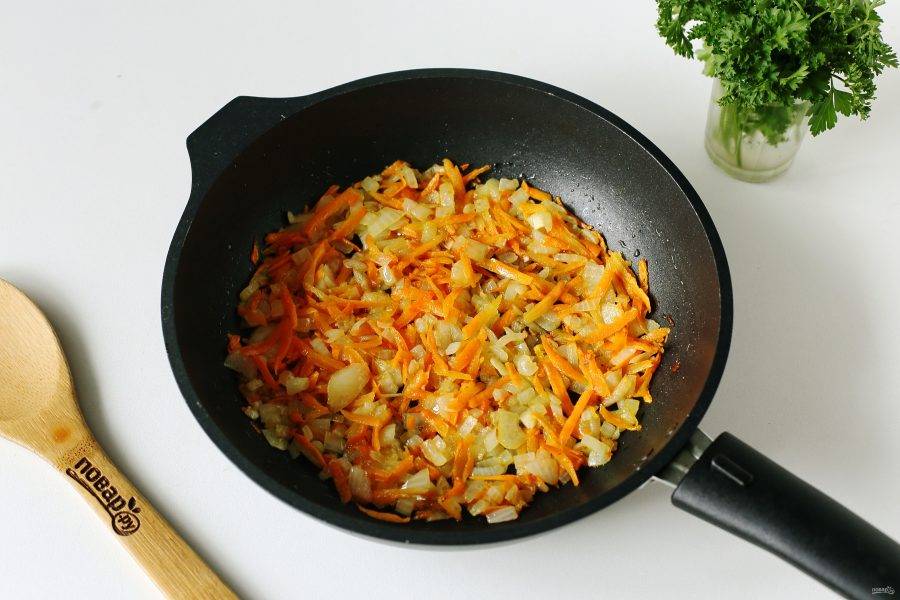 Лук нарежьте кубиками, а морковь натрите на терке. Переложите в разогретую сковороду с маслом и обжарьте до мягкости.
