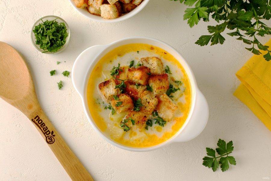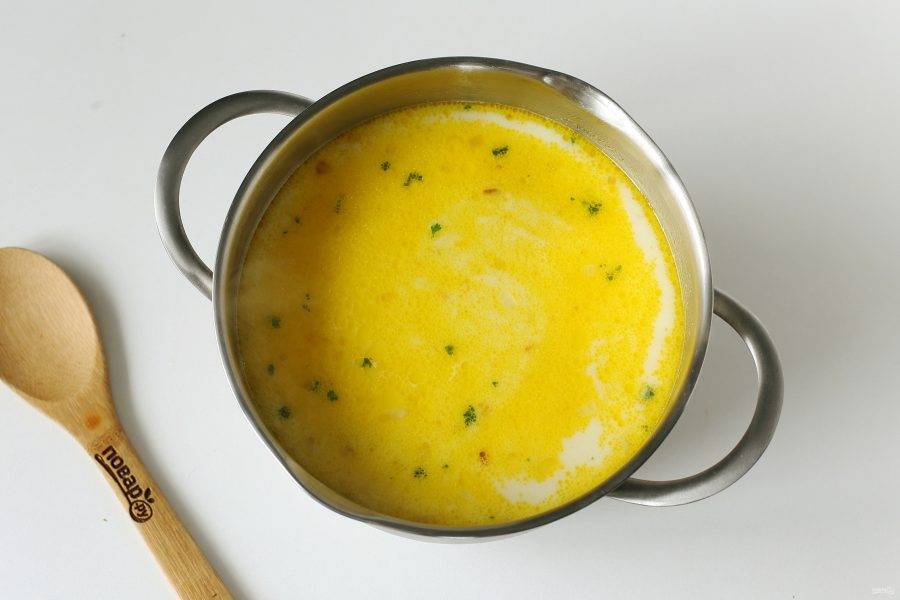В самом конце добавьте плавленый сыр, измельченный чеснок и зелень. Доведите до кипения и снимите кастрюлю с огня.