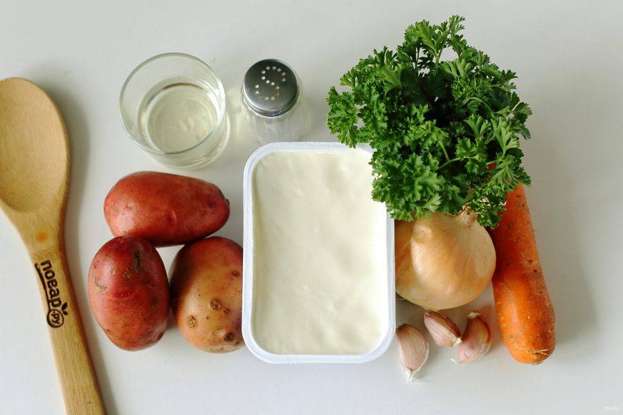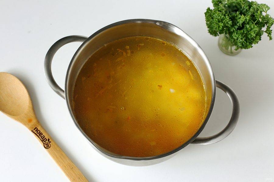 Налейте в кастрюлю воду или мясной бульон, добавьте овощи, отрегулируйте на соль и варите до готовности картофеля.