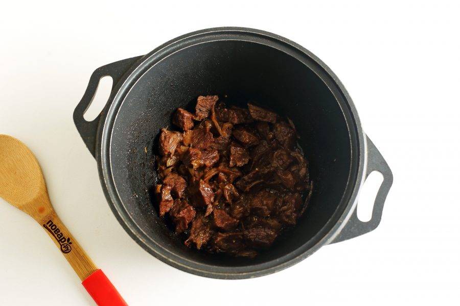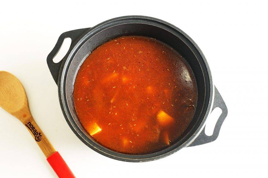 Добавьте лавровый лист, отрегулируйте на соль, убавьте огонь на самый маленький и тушите все вместе 2 часа.