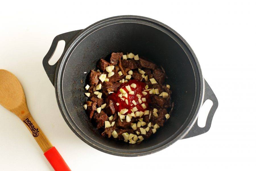Затем добавьте чеснок и томатную пасту. Тушите еще 5-7 минут периодически помешивая.