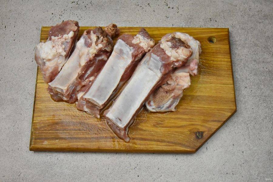 Мясо лучше использовать на кости, так бульон получится более насыщенным и ароматным. Разрежьте ребрышки на порционные кусочки.