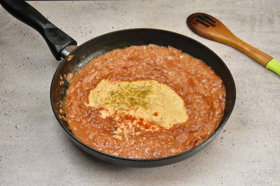 В сковороду к пассерованному луку добавьте томатную пасту и влейте пару половников бульона из кастрюли. Уварите смесь в течение 3-4 минут. Добавьте чесночно-ореховую массу, соль, хмели-сунели, красный молоты перец по вкусу.