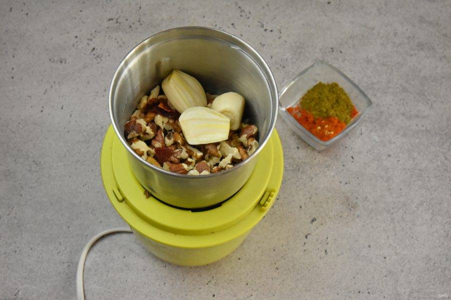 Измельчите орехи и чеснок. Это можно сделать ножом или в кофемолке, зависит от желаемой степени измельчения.