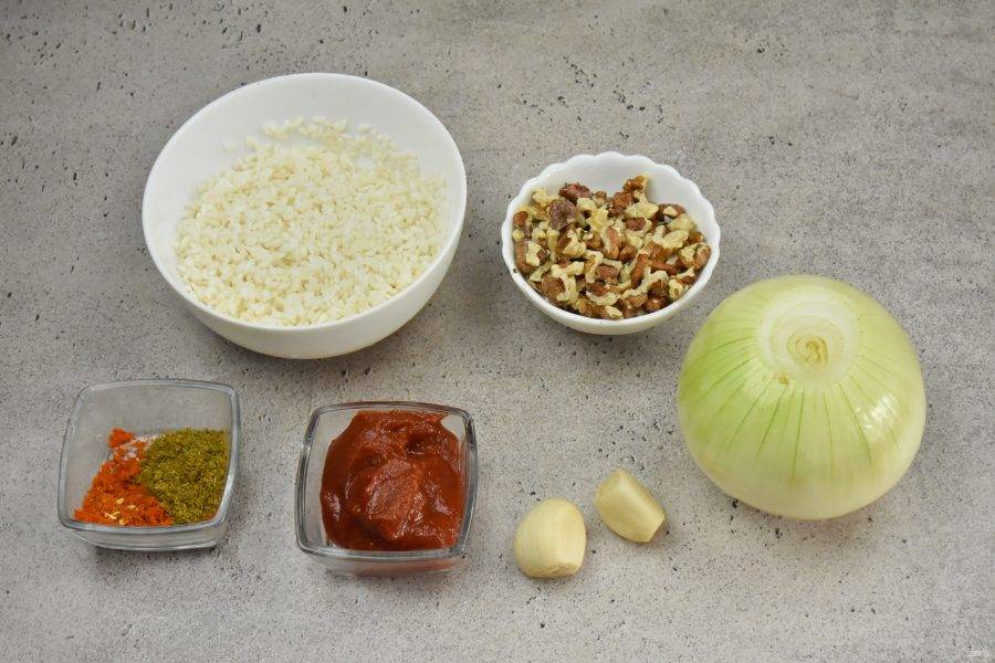 Подготовьте продукты для приготовления супа харчо. При желании в обжарку можно помимо лука добавить морковь, натертую на терке. Рис промойте под проточной водой до чистых вод и откиньте на сито. Освободите орехи от скорлупы, почистите овощи.