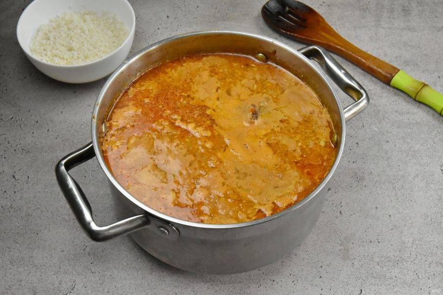 На заключительном этапе добавьте подготовленный рис. Доведите бульон до кипения и через пару минут отключите. Накройте кастрюлю крышкой и оставьте на 20 минут. За это время рис дойдет до готовности.
