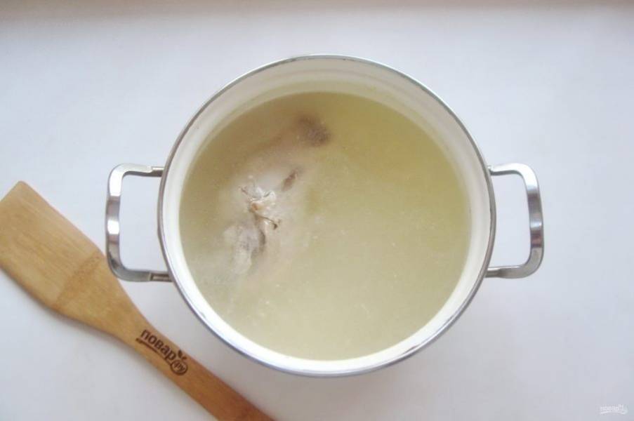 Индейку помойте и выложите в кастрюлю, залейте водой. Доведите до кипения, огонь убавьте, снимите пену.