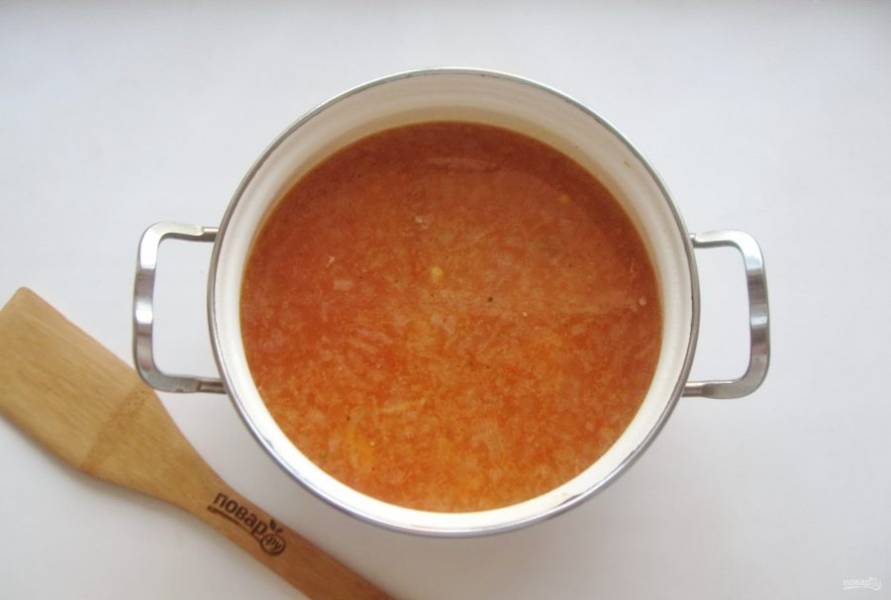 Когда рис в супе будет готов, добавьте томатную пасту с помидорами. Посолите по вкусу, добавьте приправы. Варите харчо еще 5-7 минут на минимальном огне.
