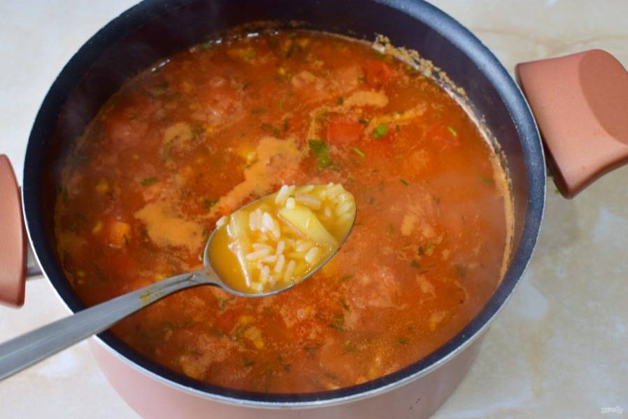 Готовую томатную поджарку отправьте в суп. Прогрейте все вместе. Попробуйте на вкус рис и картофель. Они должны стать мягкие.