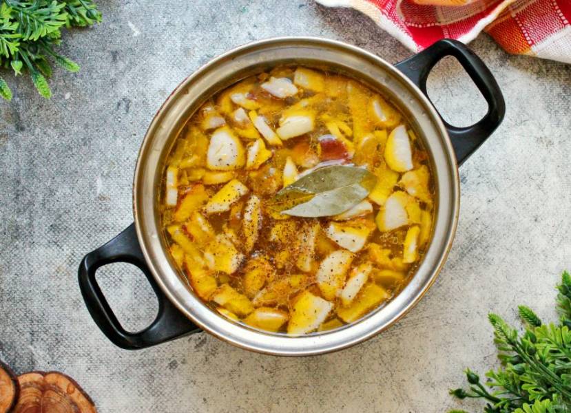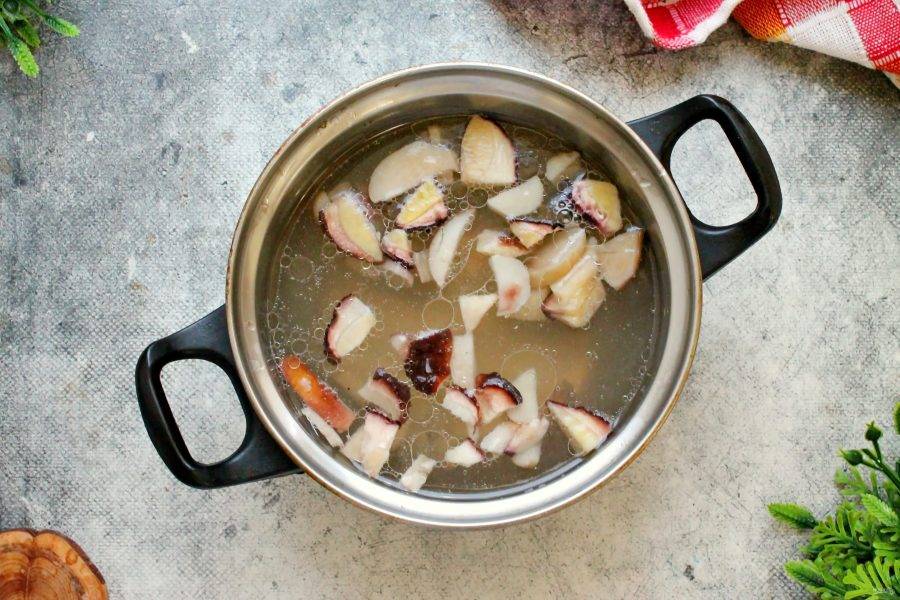 В кастрюлю налейте воду, поставьте на средний огонь и доведите до кипения. Воду посолите и выложите половину замороженных грибов. Варите все на среднем огне после закипания 15 минут, не накрывая крышкой.