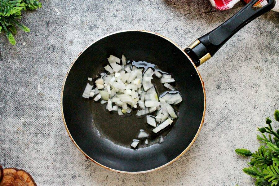 Пока варится картофель с грибами, сделайте зажарку. Для этого в сковороду налейте растительное масло и разогрейте на среднем огне. Репчатый лук порежьте средними кусочками и выложите в сковороду.