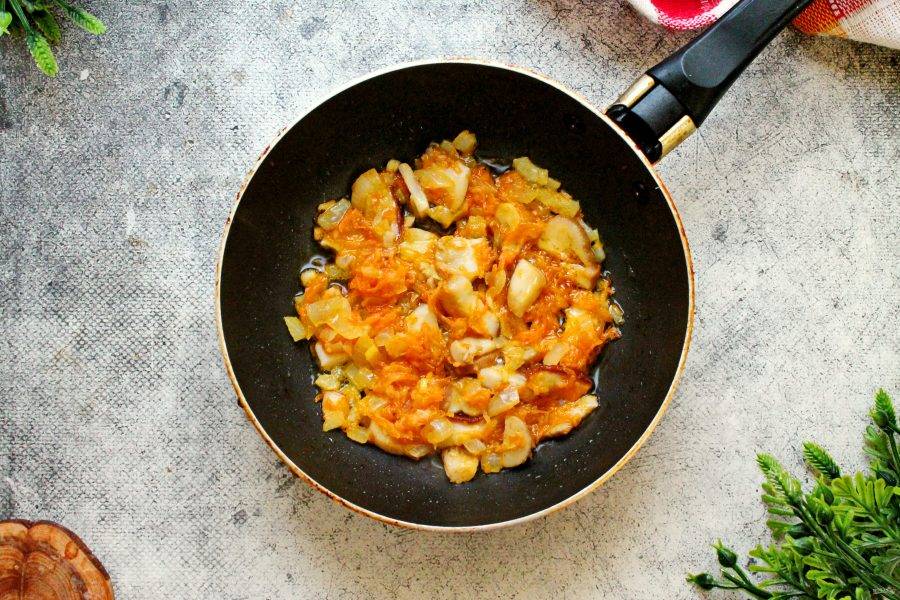 Морковь натрите на крупной терке и добавьте в сковороду с луком.