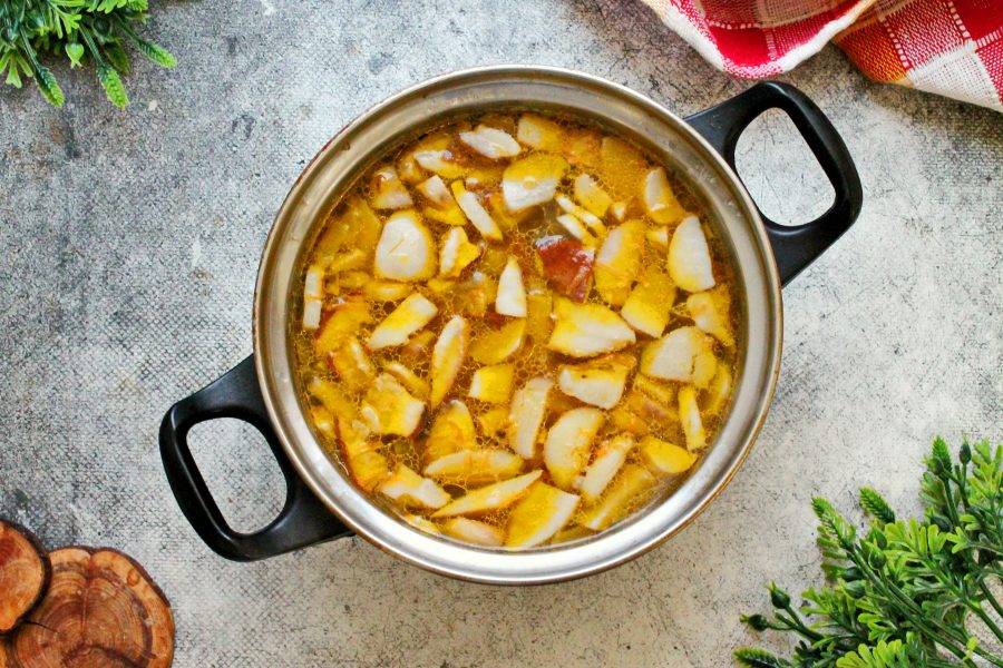 Картофель нарежьте средней соломкой, выложите в кастрюлю с белыми грибами. Варите все в течение 10-15 минут после закипания до готовности картофеля.