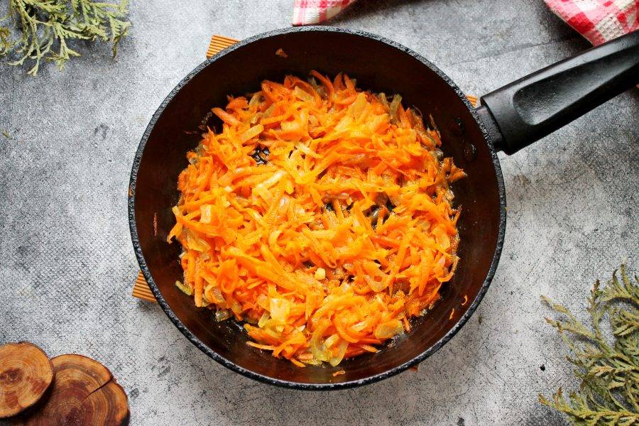 Пока варится картофель, сделайте зажарку. В сковороду налейте растительное масло, добавьте мелко нарезанный репчатый лук, тертую на крупной терке морковь. Все перемешайте и обжаривайте все на среднем огне 6-7 минут, до готовности.