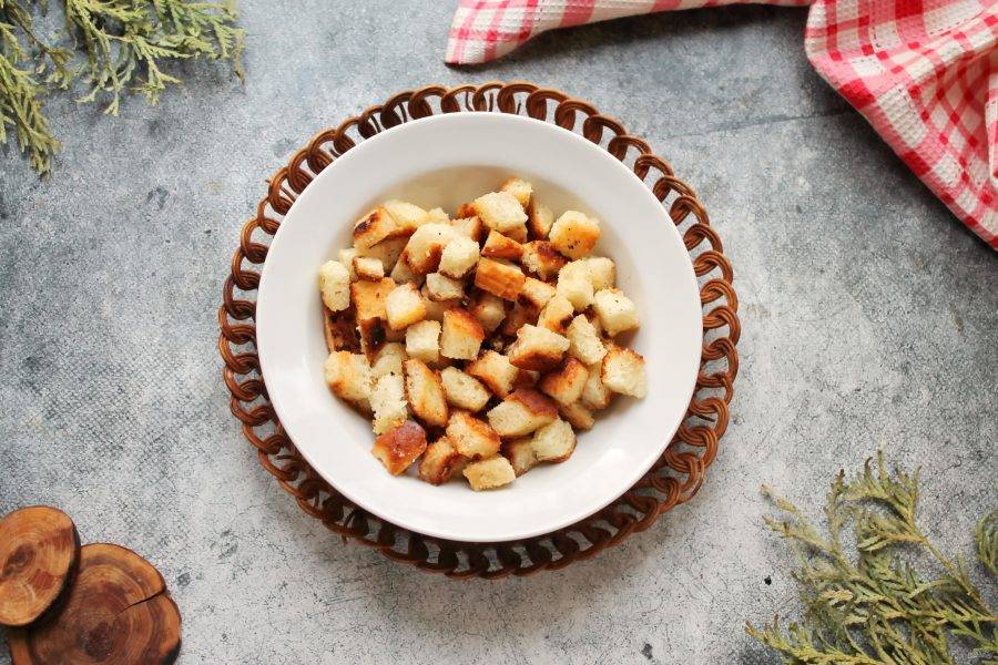 Батон порежьте кубиком, посолите, поперчите, добавьте измельченный чеснок и перемешайте. Обжарьте кусочки в сковороде с горячим маслом до румяной корочки. Снимите сковороду с огня и остудите. Готовый суп из брынзы разлейте по тарелкам, добавьте сухарики, зелень и подавайте к столу.