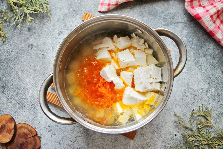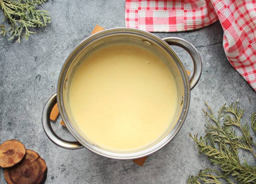 Влейте в кастрюлю сливки и доведите все до кипения. Проварите суп до растворения брынзы, мешая.