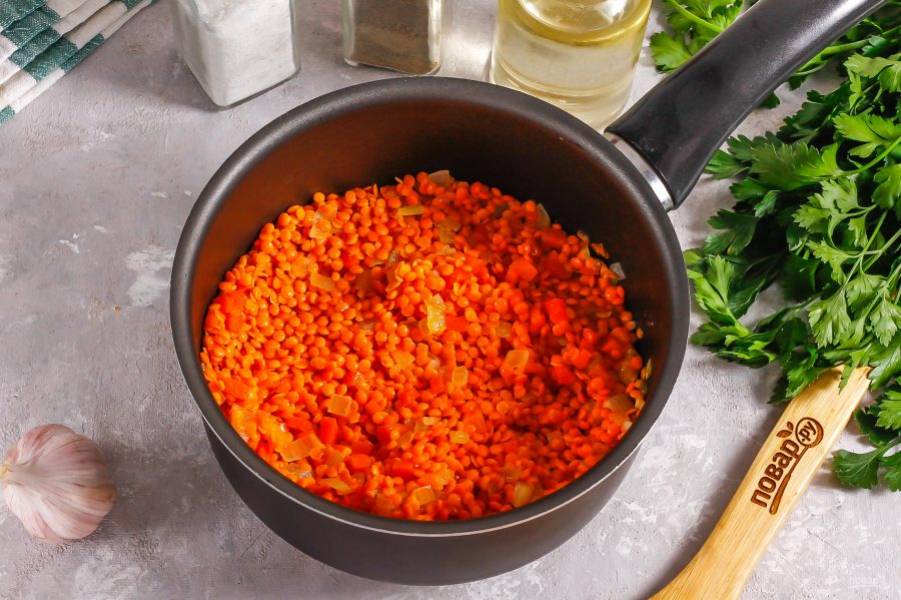 Влейте горячую воду, всыпьте соль и молотый черный перец. Отварите все примерно 20-25 минут до готовности чечевицы.