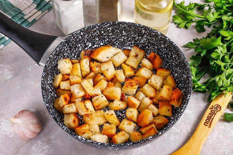В это время нарежьте хлебные ломтики кубиками любого размера, сбрызните их оставшимся растительным маслом и выложите на сковороду. Обжарьте на умеренном нагреве примерно 2-3 минуты, время от времени перемешивая их. Сухарики должны подрумяниться со всех сторон.