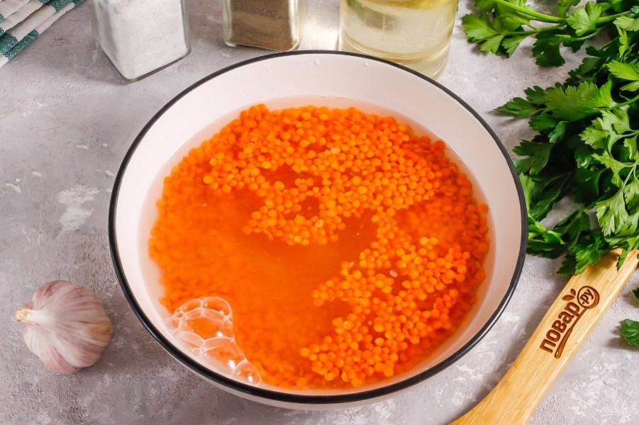 Чечевицу промойте в воде несколько раз и слейте жидкость.
