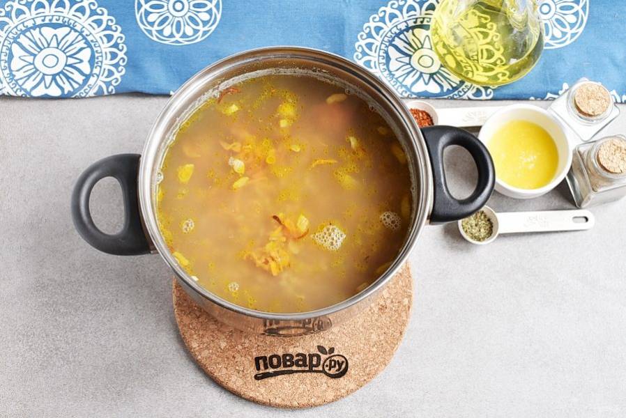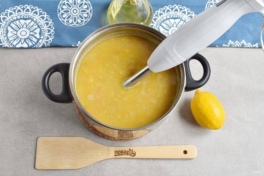 Пюрируйте суп погружным блендером до однородности.