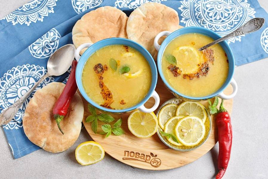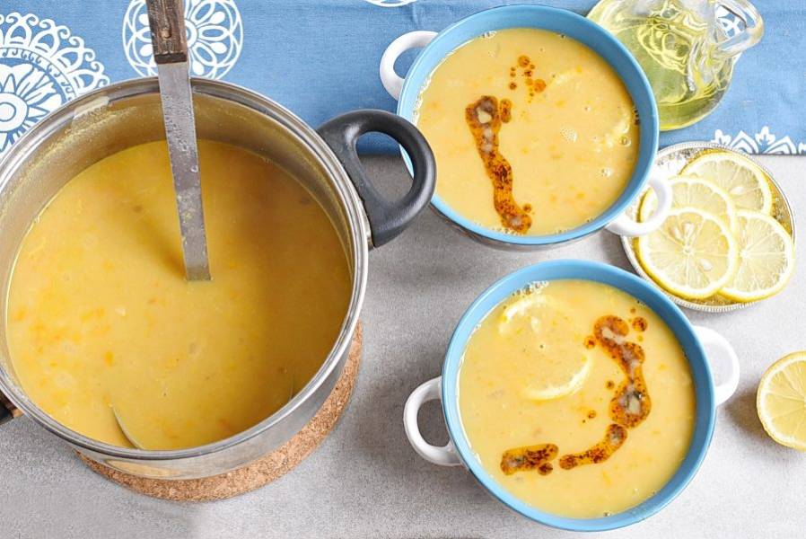 Разлейте суп по тарелкам или мискам, добавьте в каждую ломтик лимона и полейте маслом с перцем и мятой.