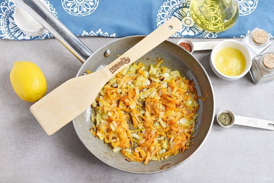 Разогрейте оливковое масло, добавьте ложку топленого и позолотите лук. Затем добавьте морковь и пассеруйте, помешивая, до мягкости и приятного аромата. Не зажаривайте слишком сильно.