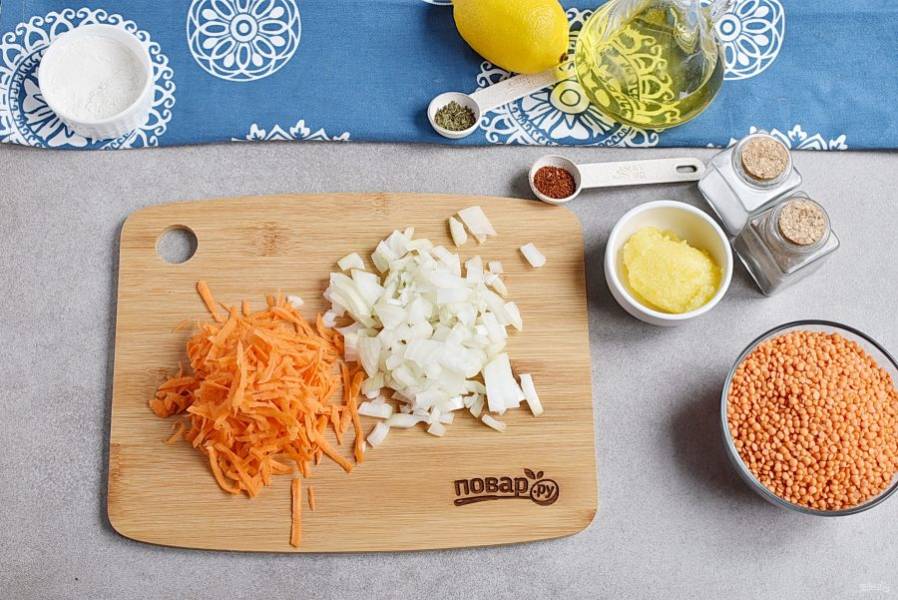 Нашинкуйте лук мелкими кубикам. Морковь натрите на крупной терке.